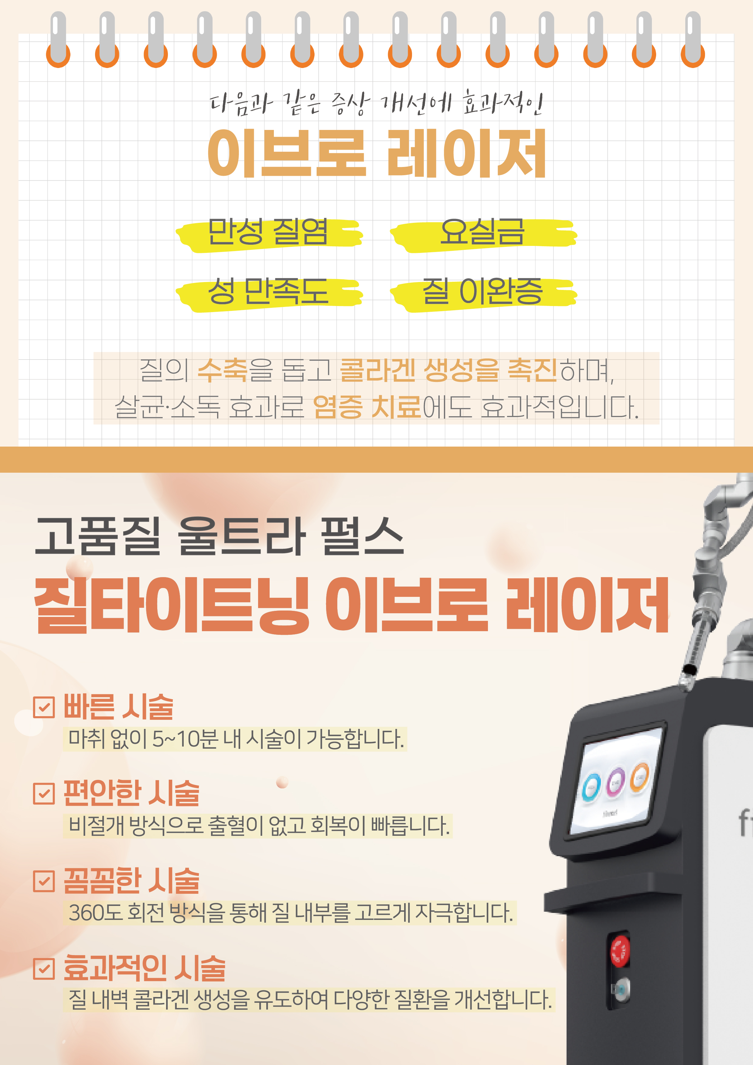 CO2 프락셀 레이저로 질의 수축을 도와주며 콜라겐이 재생성될 수 있도록 도와 질 건조증, 질 타이트닝, 요실금 개선에 효과적입니다.